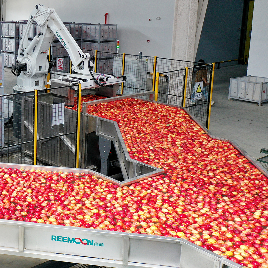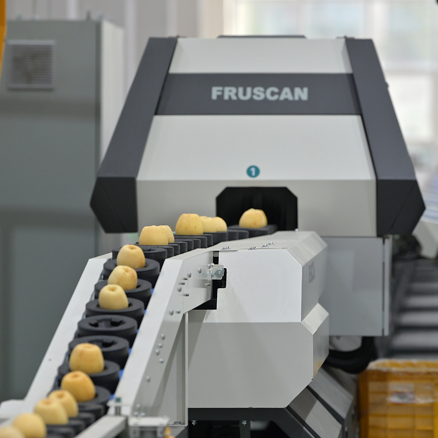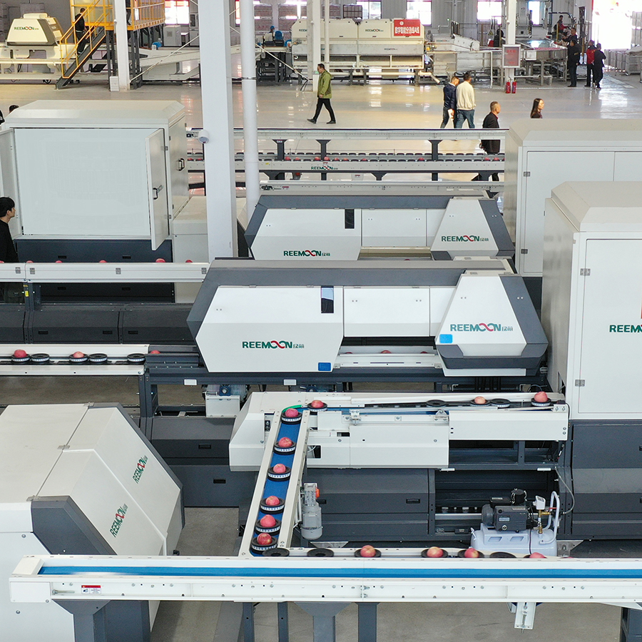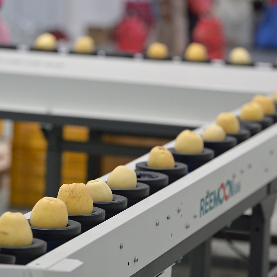 綠萌蘋果呵福式分選線,專為不耐磕碰的蘋果而設(shè)計(jì),采用柔性果杯呵護(hù),讓蘋果在分選的過程中不會(huì)被機(jī)械碰傷。綠萌 Infruscan 內(nèi)部品質(zhì)無損檢測(cè)系統(tǒng),不需切開蘋果就能夠準(zhǔn)確地識(shí)別蘋果內(nèi)部的糖度和霉心情況。可識(shí)別蘋果的品質(zhì)情況,并且將同一品質(zhì)的蘋果輸送到同一出口進(jìn)行包裝。