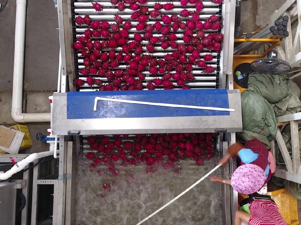 高壓噴淋清洗,對(duì)火龍果表面進(jìn)行清潔,將泥污煙煤等清洗掉。清洗完后用滾筒輸送,防止互相碰撞傷果。