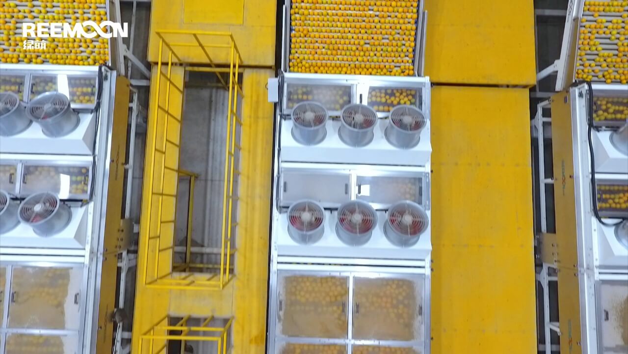 用滾筒式烘干機(jī)利用離心風(fēng)機(jī)吸收游離的熱風(fēng)形成循環(huán)從而對沃柑的表皮進(jìn)行烘干。