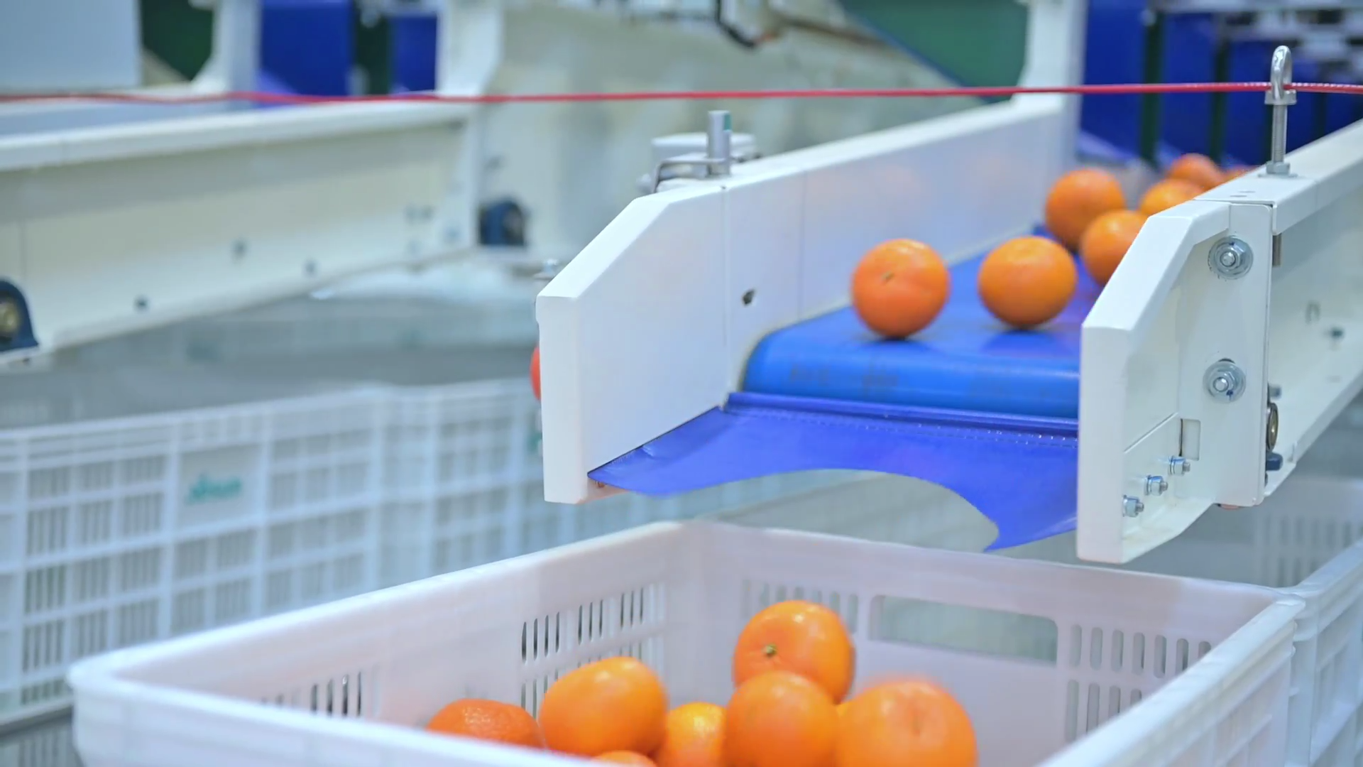 機(jī)器人手臂自動上料后,果框輸送到入料口側(cè)翻倒果,沃柑通過滾筒輸送到分選線上,空框則進(jìn)入回收系統(tǒng)。