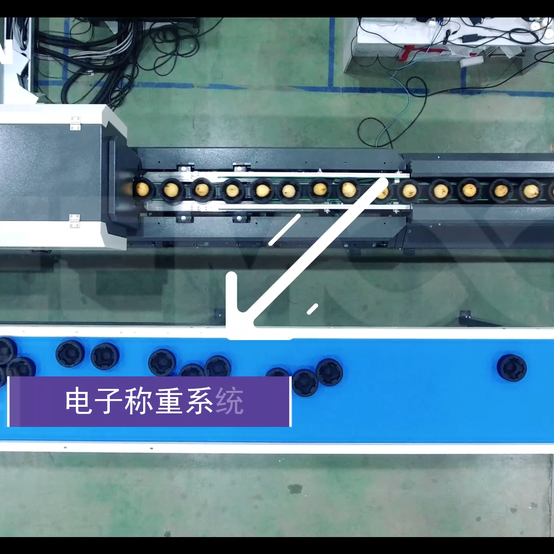 電子稱重系統(tǒng)根據(jù)客戶的設(shè)定對(duì)梨進(jìn)行稱重,隨后根據(jù)稱重結(jié)果分流到不同的包裝口,保證每箱梨在重量上的勻稱性。