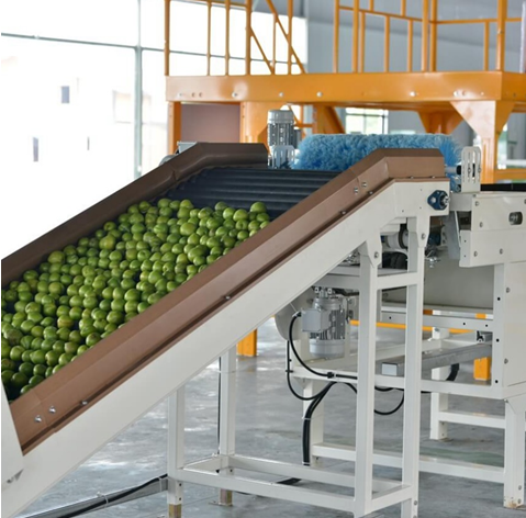 李子倒果后,由動(dòng)力滾筒機(jī)提升上料。